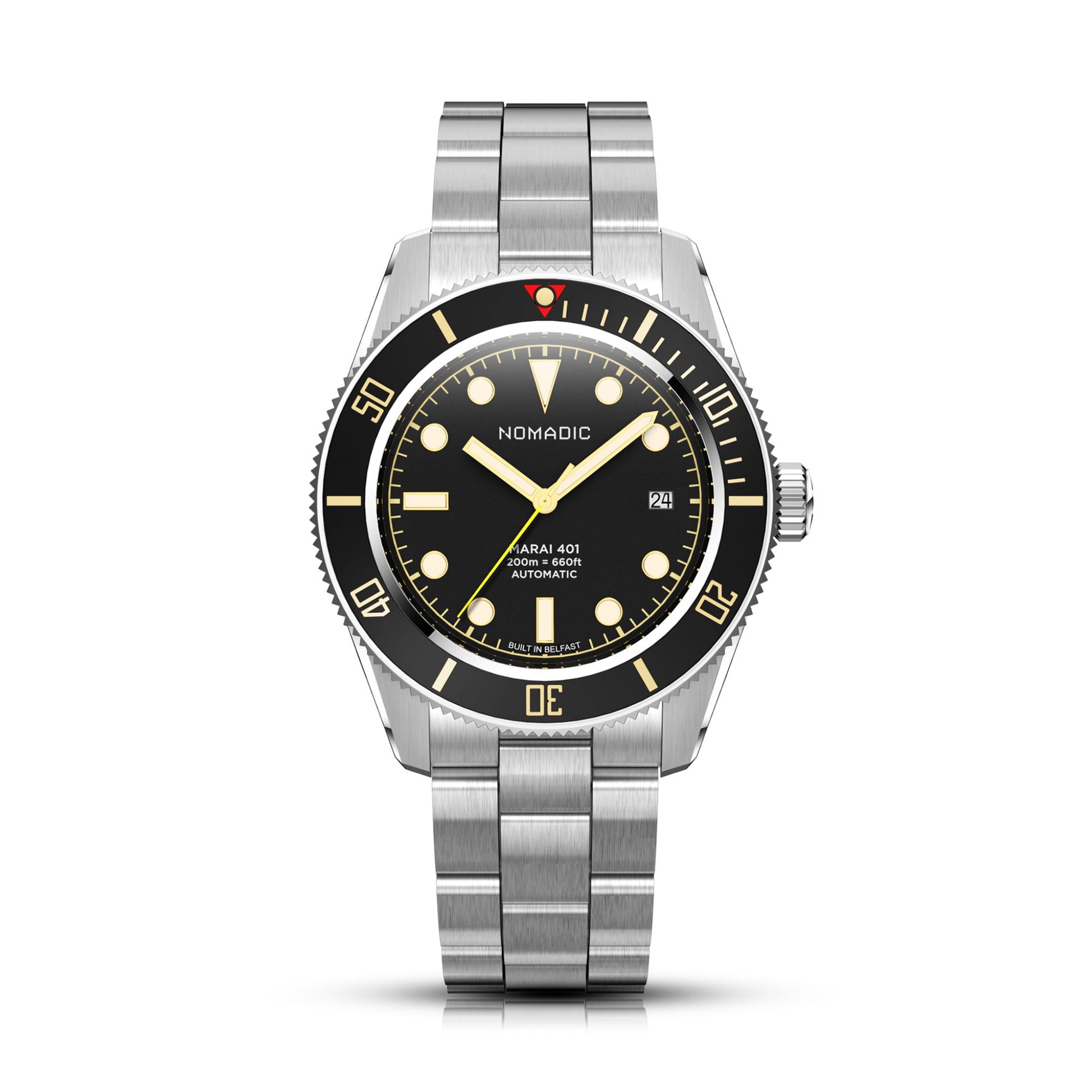 With a 40mm case, 660ft water resistance and a Swiss mechanical movement, Marái 401 echoes Belfast’s greatest engineering feats. The unmistakable sweeping yellow second hand is a humble nod to those iconic cranes.